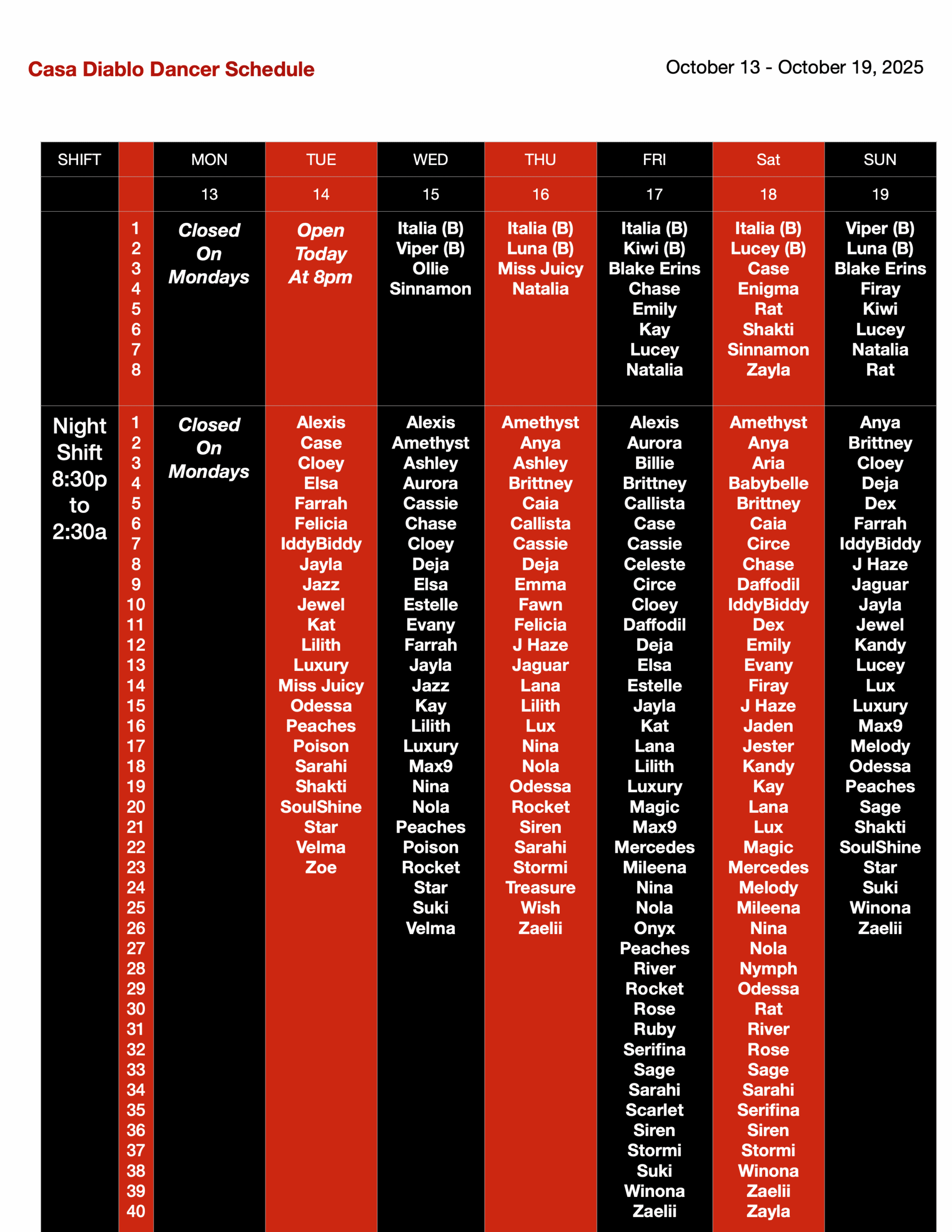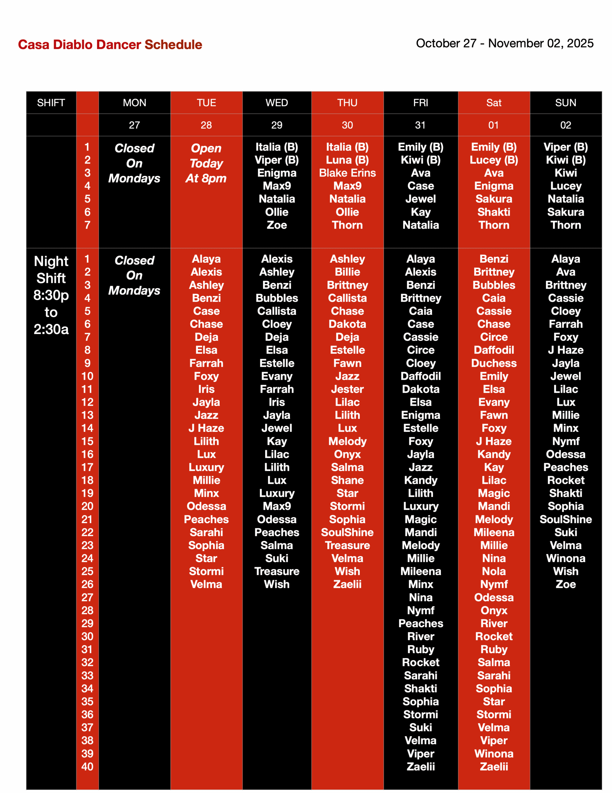THIS WEEK’S DANCER SCHEDULE:
