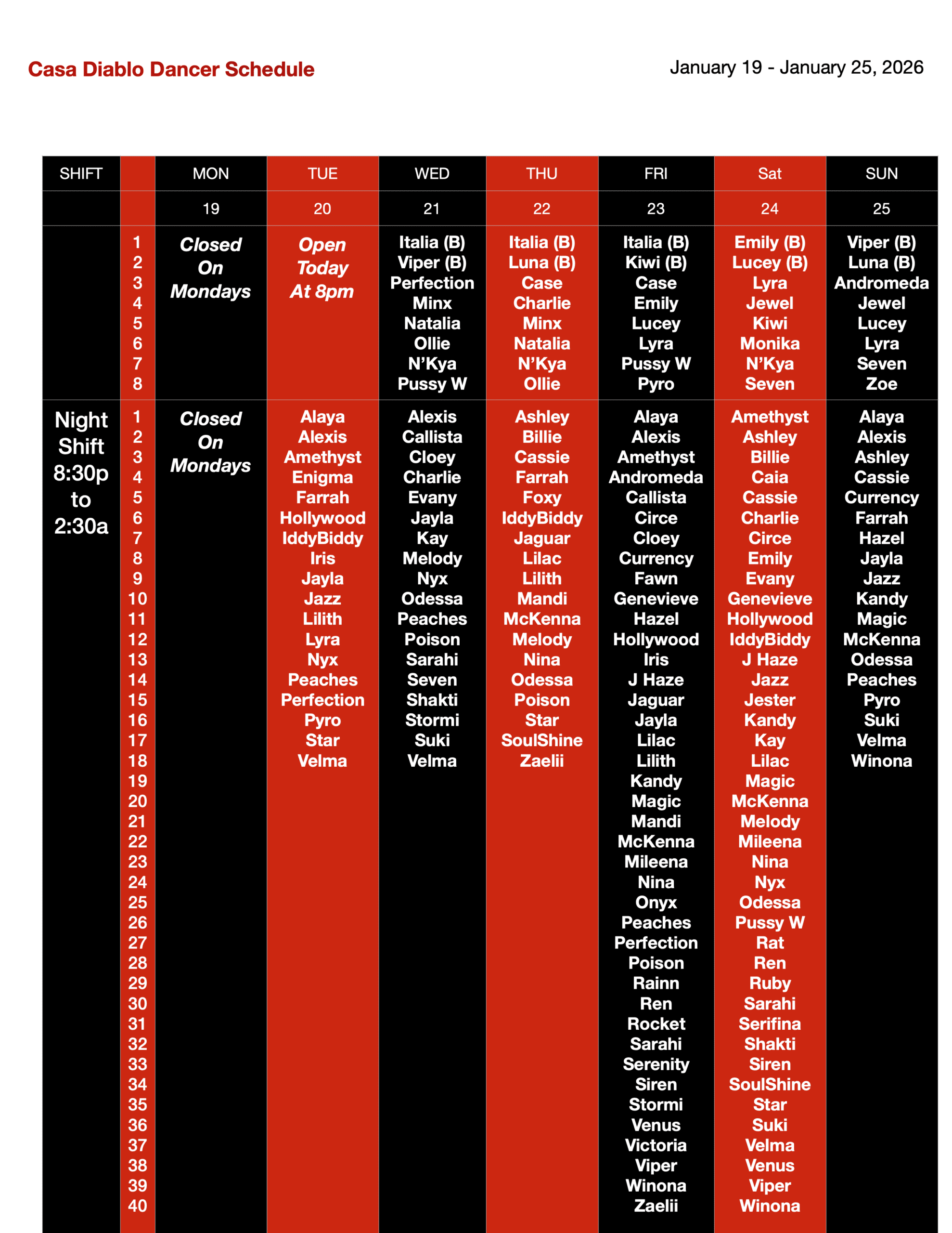 • THIS WEEK’S DANCER SCHEDULE: