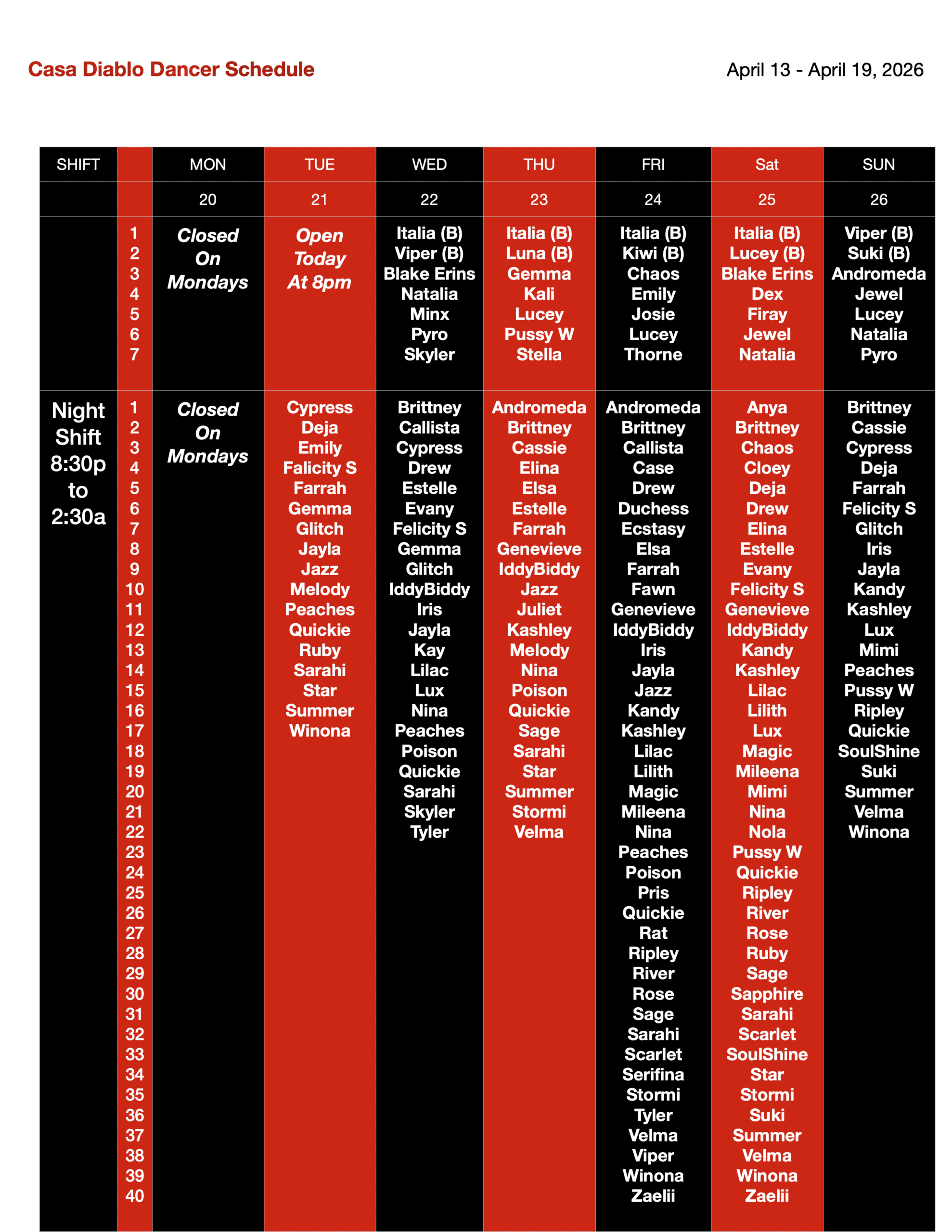 LEARN ABOUT OUR WORLD FAMOUS DANCERS THIS WEEK’S DANCER SCHEDULE: Carrots September 12 – September 18, 20223 FEATURED DANCERS CLICK EACH DANCER TO LEARN MORE FELICIAROSELUXMAGICGENEVEIVECELESTEEVANYBRITTNEYMANDIZAELIISALMABEVERLYSCARLETAMETHYSTIDDYBIDDYLUNAKAYNADIARUBYSUKIHOLLYWOODBENZIVIPERMELODYJUPITER HAZEMERCYAURORACHASEOLLIEWISHSONORAMELROSEPOISONPYRODEXCASERAINNTYLERMAX9LEAHASHLEYNATALIACHANEL RAYENIZHONIAUDREYPASSIONDANIKATNISSANNABELLEBLAZEBELLADONNAGRACECHEVYCARMENDOJARYANNETTAROCKYANGELVIVITROUBLESAKURALONDONSTARLITCHLOEKEHLANIVIOLETLIZALINATTJOSIENATALIEEPIPHANYLOKISTAR CAKES